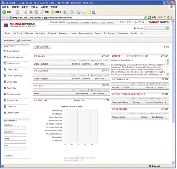 SugarCRM的默認界面提供了個人門戶、日歷、事件、聯(lián)系人、機會管理、項目、問題追蹤、文檔等常用模塊,用戶還可以根據(jù)自己的需要增加新的模塊。當前,SugarCRM已經(jīng)能夠較好地支持簡體中文,即使在英文界面中,也可以顯示和編輯中文字符,但在基于中文的排序方面尚未實現(xiàn)。另外,雖然SugarCRM提供了簡體中文語言包,但是只支持UTF-8編碼,在我們實測中發(fā)現(xiàn)會有亂碼問題,因此建議用戶還是選擇在英文界面中處理簡體中文。
