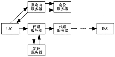 如圖2所示,SIP網(wǎng)絡采用IP網(wǎng)絡常用的客戶機/服務器(C/S)結(jié)構(gòu),定義了若干種不同的服務器和用戶代理,通過與服務器之間的請求和響應完成呼叫和傳送層的控制。
