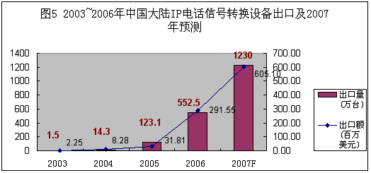 圖5:2003-2006年中國大陸IP電話信號轉(zhuǎn)換設(shè)備出口及2007年預測。