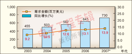 圖7:2003-2006年中國大陸IP電話信號轉(zhuǎn)換設(shè)備需求增長及2007年預測