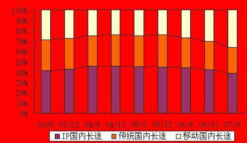 從圖中可以看出,IP電話的相對(duì)快速增長(zhǎng)在一定程度上對(duì)傳統(tǒng)長(zhǎng)途電話形成了替代作用,但近年來(lái)自于移動(dòng)長(zhǎng)途的替代作用更明顯。從占比上來(lái)看,2007年上半年,IP國(guó)內(nèi)長(zhǎng)途電話占全部國(guó)內(nèi)長(zhǎng)途通話量38.3%,超過移動(dòng)長(zhǎng)途電話的35.9%和傳統(tǒng)長(zhǎng)途電話的25.8%,仍然是長(zhǎng)途電話的主流。