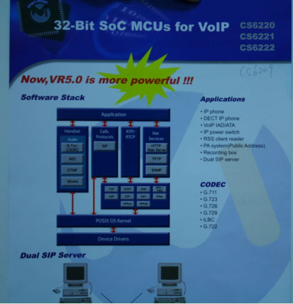 網(wǎng)關(guān)器及IP PBX應(yīng)用的市場的產(chǎn)品包括CS6209、CS6220、CS6221、CS6222、CS6223等,并提供了非常完善的解決方案。為了更好的服務(wù)于大陸客戶,目前,世紀(jì)民生在大陸的深圳、武漢和上海都設(shè)有分公司,并且在各分公司之間已經(jīng)在穩(wěn)定的使用VoIP來進行溝通。
