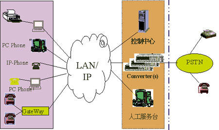 如圖點(diǎn)劃線左邊所示,IP PBX系統(tǒng)通過在網(wǎng)絡(luò)中加入控制中心并利用原有網(wǎng)絡(luò)的結(jié)點(diǎn)(多媒體配置),將LAN改造為PBX電話網(wǎng)絡(luò)。IP