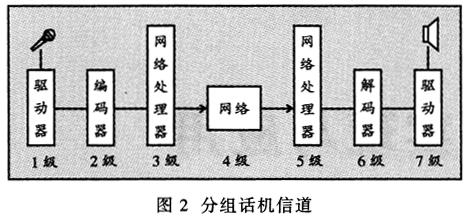 ——無論對(duì)于實(shí)時(shí)的應(yīng)用(如IP電話)還是非實(shí)時(shí)的應(yīng)用(如語音郵件),發(fā)送端語音都要經(jīng)過模擬信號(hào)—數(shù)字信號(hào)—語音包的處理過程,并在接收端對(duì)語音包進(jìn)行相反的處理,從而得到與輸入端相同的語音信號(hào)。由圖2可見,每個(gè)語音流從信源(話筒)到信宿(揚(yáng)聲器)就像通過一條管道,這條管道包括許多級(jí),每一級(jí)代表一些特有的語音包處理過程。