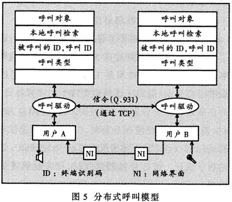 ——IP電話采用分布式的呼叫模式。因?yàn)椴恍枰ㄟ^電路交換完成呼叫,所以每個(gè)終端都使用了呼叫處理器。單工呼叫模式僅支持一個(gè)終端的呼叫,且需要本地呼叫驅(qū)動(dòng)的支持。通過觸發(fā)本地呼叫驅(qū)動(dòng)軟件建立一次呼叫,而呼叫驅(qū)動(dòng)利用傳輸控制協(xié)議(TCP)的套接字(Socket)與另一端的呼叫驅(qū)動(dòng)建立信令連接,從而觸發(fā)另一端的單工呼叫。這兩個(gè)單工呼叫被觸發(fā)后按照Q.931信令協(xié)議完成呼叫過程的建立。根據(jù)信令的引導(dǎo),呼叫驅(qū)動(dòng)程序啟動(dòng)語音信息流接入網(wǎng)絡(luò)和對(duì)端的接收設(shè)備,建立一個(gè)完整的呼叫過程(圖5)。圖5中的呼叫對(duì)象指明本次呼叫的域名、兩端的終端識(shí)別碼(ID)或電話號(hào)碼、呼叫類型(如單純語音、語音和數(shù)據(jù))等信息。