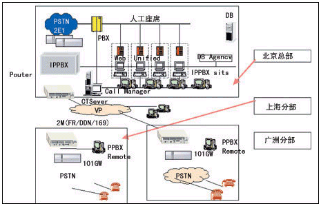 建設(shè)分布式呼叫中心系統(tǒng),從技術(shù)角度講,關(guān)鍵在于單點(diǎn)系統(tǒng)平臺、多點(diǎn)之間聯(lián)網(wǎng)和路由以及整個系統(tǒng)的統(tǒng)一管理三個方面。對于單點(diǎn)系統(tǒng)平臺的選擇,需要結(jié)構(gòu)簡單、投資適中、易于建設(shè),還需要采用開放式結(jié)構(gòu),以易于聯(lián)網(wǎng)、智能路由和統(tǒng)一管理;對于多點(diǎn)之間聯(lián)網(wǎng),一般數(shù)據(jù)通過廣域網(wǎng)傳遞,語音可以通過公共電話網(wǎng)(市話網(wǎng)和長話網(wǎng))傳遞,也可以采用VoIP技術(shù)與數(shù)據(jù)同在廣域網(wǎng)上傳遞;對于多點(diǎn)之間的智能路由和統(tǒng)一管理,物理上分布的多個系統(tǒng)完全可以看成邏輯上的一個系統(tǒng),利用專門的軟件實(shí)現(xiàn)統(tǒng)一管理和智能路由,包括呼叫前/后路由、智能呼叫溢出、坐席信息傳播、統(tǒng)一的實(shí)時狀態(tài)監(jiān)控和報表生成等,實(shí)現(xiàn)多個系統(tǒng)之間的負(fù)載均衡和災(zāi)難備份。