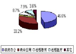 視頻會(huì)議系統(tǒng)在我國(guó)開(kāi)始發(fā)展的初期,政府部門的應(yīng)用就占據(jù)了重要位置,覆蓋中央到直轄市和各省會(huì)城市的國(guó)家公眾視頻會(huì)議骨干網(wǎng)已經(jīng)完工。自1994年9月投入使用以來(lái),國(guó)務(wù)院等機(jī)關(guān)先后利用該網(wǎng)召開(kāi)了三百多次全國(guó)范圍的可視通訊會(huì)議。整個(gè)系統(tǒng)運(yùn)行情況良好,得到了國(guó)家領(lǐng)導(dǎo)人和各部委領(lǐng)導(dǎo)的高度贊揚(yáng)。近年來(lái)隨著電子政務(wù)工程的逐步推進(jìn),政府部門更加關(guān)注視頻會(huì)議系統(tǒng)建設(shè)。在經(jīng)濟(jì)發(fā)達(dá)地區(qū)(例如浙江、山東、廣東),視頻會(huì)議網(wǎng)已覆蓋到地市級(jí)城市,有的甚至覆蓋到縣一級(jí)。除各級(jí)政府之外,其它諸如檢察院、法院、公安和和水利等職能部門也是視頻會(huì)議系統(tǒng)的重要用戶。如圖1所示,政府辦公已占全部市場(chǎng)份額的46.6%。