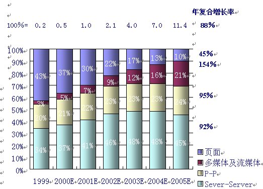 同時(shí),人們對(duì)P-P的互動(dòng)及多媒體的傳輸?shù)男枨髮⒊蔀榫W(wǎng)絡(luò)使用的2個(gè)最主要的發(fā)展趨勢。據(jù)麥肯錫公司和JP摩根的分析和預(yù)測,多媒體及流媒體的IP流量將以每年154%的復(fù)合率增長,而P—P的IP流量將以95%的年復(fù)合增長率增長,這2項(xiàng)將成為用戶需求增長最快的業(yè)務(wù)。如下圖,