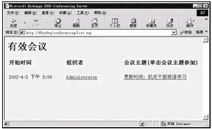 如果在前面已設(shè)置了提醒功能,那么在臨近會議前屏幕上將出現(xiàn)提醒窗口。教師機和學(xué)生機有三種方法可以參加會議:點擊提醒窗口中[參加會議]按鈕;或者不等提醒,直接點擊會議邀請函中的鏈接打開會議網(wǎng)頁;最好的方式還是打開IE,輸入網(wǎng)址http://x/conferencing/list.asp進(jìn)入會議(x為Exchange服務(wù)器的IP地址或計算機名),如圖3。