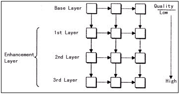 關(guān)于分層可擴(kuò)展性編碼的研究可以追溯到10年前,目前它已經(jīng)被許多現(xiàn)行的國(guó)際壓縮標(biāo)準(zhǔn)接納,例如H.263+和MPEG-4。分層可擴(kuò)展編碼主要有三種:時(shí)域可擴(kuò)展性、空域可擴(kuò)展性和質(zhì)量可擴(kuò)展性。其中質(zhì)量可擴(kuò)展性也稱(chēng)為PSNR可擴(kuò)展性,原因是視頻質(zhì)量通常用峰值信噪比(PSNR)來(lái)衡量。