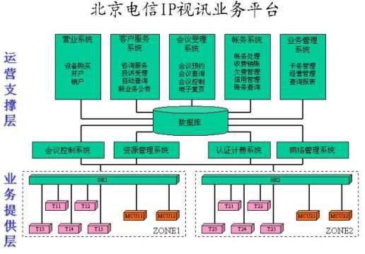 在整個運(yùn)營支撐層的系統(tǒng)中,主要包括四大系統(tǒng),即會議控制系統(tǒng)、資源管理系統(tǒng)、認(rèn)證計(jì)費(fèi)系統(tǒng)、網(wǎng)絡(luò)管理系統(tǒng)。除此之外,還有其它幾個輔助系統(tǒng),包括營業(yè)系統(tǒng)負(fù)責(zé)為客戶開戶和銷戶,終端注冊等處理;客戶服務(wù)系統(tǒng)提供咨詢服務(wù)、投訴受理、自動查詢和幫助客戶進(jìn)行會議預(yù)約,在資源不足的情況下進(jìn)行會議調(diào)度等;會議受理系統(tǒng)是面向客戶提供會議電視業(yè)務(wù)預(yù)約、會議狀態(tài)查詢、會議控制服務(wù),由用戶自助完成預(yù)約會議和控制會議的操作;賬務(wù)系統(tǒng)負(fù)責(zé)賬務(wù)方面的管理,包括賬務(wù)管理,收費(fèi)銷賬,催繳欠費(fèi)、銀行繳費(fèi)等;業(yè)務(wù)管理系統(tǒng)主要是記賬卡的卡務(wù)處理、經(jīng)營管理、查詢報(bào)表等。