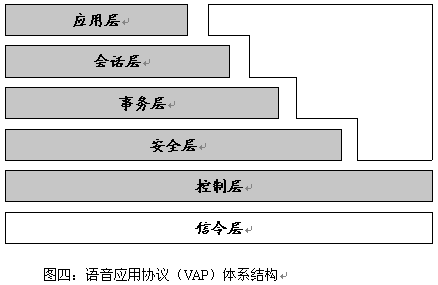 語(yǔ)音應(yīng)用協(xié)議(VAP VA)也有一個(gè)類似于TCP/IP和WAP的層次結(jié)構(gòu),如下圖(圖四)所示: