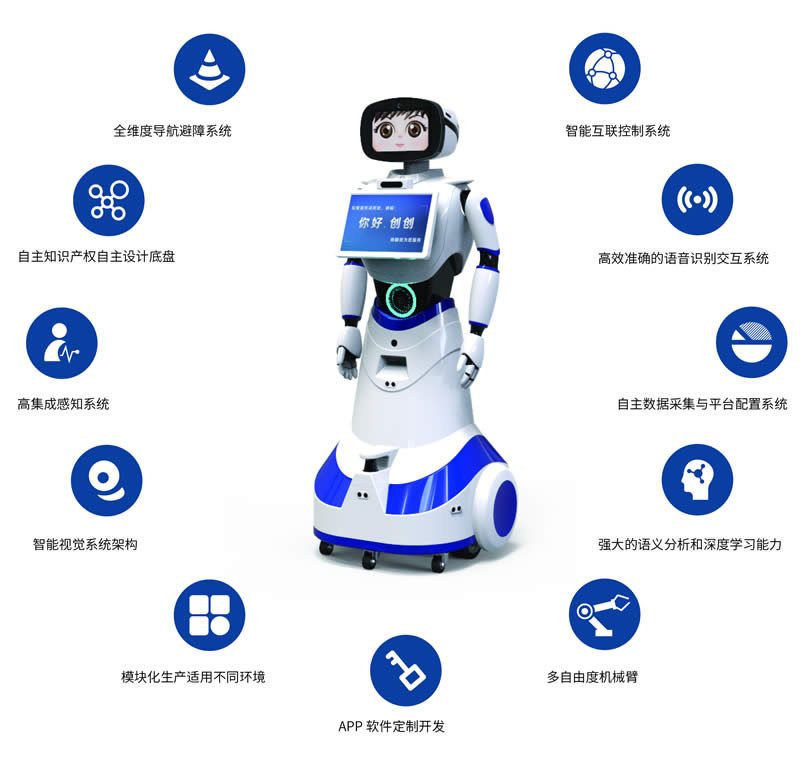 基于人工智能(Al)和機(jī)器學(xué)習(xí)(ML)技術(shù)L域的突破,經(jīng)過(guò)精細(xì)調(diào)研與充分論證,確保機(jī)器人控制智能、性能穩(wěn)定,通過(guò)不斷地創(chuàng)新研發(fā),重新定義服務(wù)機(jī)器人。智能商用服務(wù)機(jī)器人"創(chuàng)創(chuàng)" 集視覺(jué)、聽(tīng)覺(jué)、觸覺(jué)、自由行走干—體。 可廠泛用于政符、金G、展館展廠工、教育、醫(yī)療、圖書館、商招、昌等L域。滿足客廣多元化需求。 "創(chuàng)創(chuàng)" 率先實(shí)現(xiàn)了把機(jī)器人的"大腦"和"小腦"完全向客戶開(kāi)放,由止此可以迅速學(xué)習(xí)各個(gè)行業(yè)的專業(yè)知識(shí)并成為各個(gè)行業(yè)的專家。"創(chuàng)創(chuàng)"是您的小助手,好朋友!