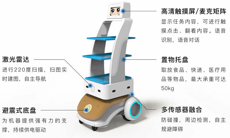 智能配送機(jī)器人是一款針對現(xiàn)代化使用環(huán)境開發(fā)的智能機(jī)器人。具有自主行走,自主避障,防跌落,自主語音提示、自主充電、防跌落等功能。多載體設(shè)計,適合車站、校園、醫(yī)院、物流、機(jī)場、酒店、商場等多場合、多用途使用,在降低人員勞動強(qiáng)度的同時,大幅度節(jié)省運(yùn)營成本,提G工作效率,提升服務(wù)質(zhì)量,幫助實現(xiàn)工作場景信息化、智能化、科技化、現(xiàn)代化,提供良好的服務(wù)體驗。