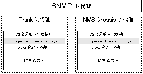 SNMP采用了Client/Server模型的特殊形式:代理/管理站模型。對(duì)網(wǎng)絡(luò)的管理與維護(hù)是通過(guò)管理工作站與SNMP代理間的交互工作完成的。每個(gè)SNMP從代理負(fù)責(zé)回答SNMP管理工作站(主代理)關(guān)于MIB定義信息的各種查詢(xún)。下圖10是NMS公司網(wǎng)絡(luò)產(chǎn)品中SNMP協(xié)議的實(shí)現(xiàn)模型。