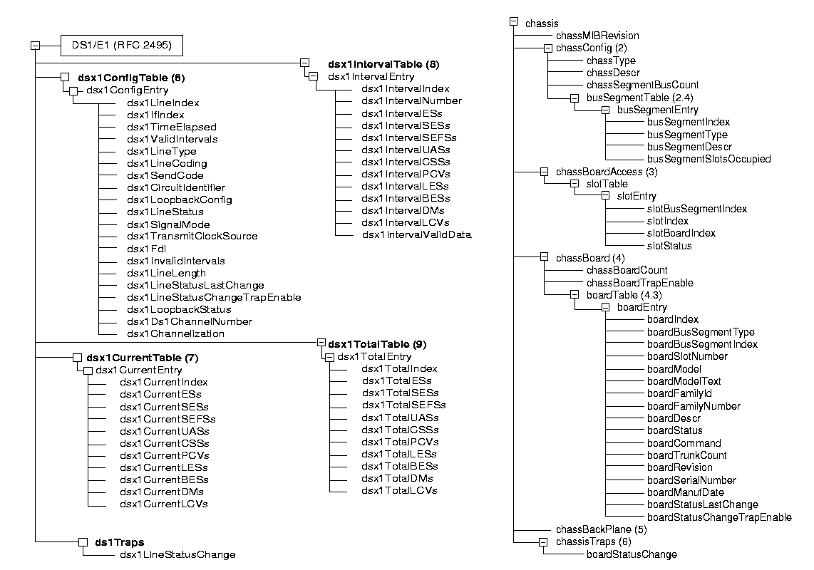 圖14中左圖給出了RFC2495對(duì)DS1/E1中繼線的MIB信息樹(shù)圖,右圖是NMS系統(tǒng)中對(duì)機(jī)架Chassis管理MIB約定。
