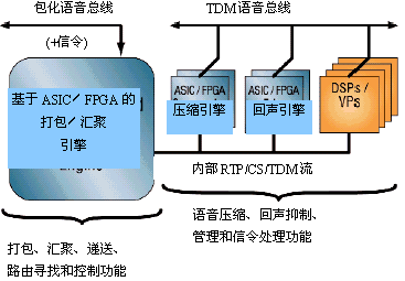 由于ASIC/FPGA技術是一種定制設計技術,不會輕易更改,主要是因為從設計到投放市場需要不短的周期。這使得最適合用ASIC定做的是成熟的、充分定義的、反復使用不會頻繁更改的功能。在VoP網(wǎng)關中使用ASIC的目的是實現(xiàn)打包、回聲抑制和壓縮功能,減輕DSP/RISC的負荷,而不是替換它們。