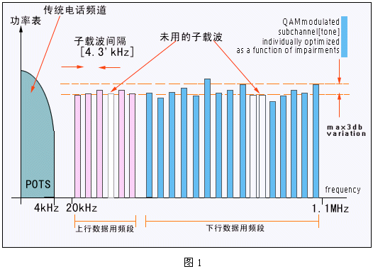 DSL技術(shù)是在人們對高速互聯(lián)網(wǎng)訪問需求推動下的產(chǎn)物。DSL利用頻率復(fù)用和OFDM調(diào)制技術(shù),在不影響傳統(tǒng)電話業(yè)務(wù)的前提下可以為用戶提供最高達(dá)8Mbps的數(shù)據(jù)傳輸速率。這個速率是基于POTS的Modem速率(以目前的最高速率56kbps為參考)的140倍;DSL技術(shù)所帶來的巨大帶寬為家庭和小型公司提供了一個寬帶數(shù)字業(yè)務(wù)的新平臺。這個DSL平臺可以支持多種寬帶業(yè)務(wù):包括高速Internet接入、虛擬專網(wǎng)及VOD等流媒體業(yè)務(wù)。其基本原理如下圖1所示:
