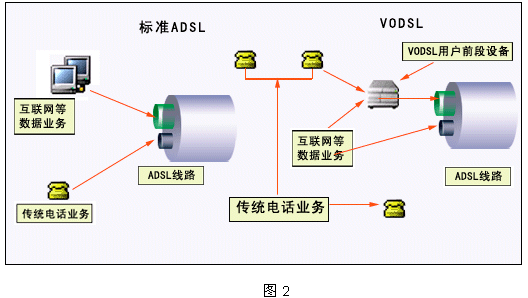 VoDSL技術(shù),就是利用xDSL技術(shù)在一對傳統(tǒng)電話用戶線上,維持原有電話業(yè)務(wù)的同時,提供高速數(shù)據(jù)業(yè)務(wù)(如互聯(lián)網(wǎng)業(yè)務(wù))和多個額外電話業(yè)務(wù)。利用VoDSL技術(shù),業(yè)務(wù)提供商在無需增添新的數(shù)據(jù)網(wǎng)絡(luò)或硬件線路就可以為用戶提供高速的數(shù)據(jù)接入和更多的電話線路數(shù)及其他增值業(yè)務(wù),從而減少運(yùn)營成本,擴(kuò)大了利潤空間。下圖2的左邊給出了電話運(yùn)營商采用ADSL技術(shù)的基本配置,右邊則給出了VoDSL應(yīng)用。
