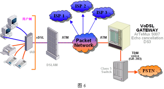 這種方式又稱為VoMBN/VoMSBN(Voice over Multi-service Broadband Network)。圖5給出了MSDN的邏輯結(jié)構(gòu)這種方式下,DSL本地環(huán)路和PSTN及Internet間的互聯(lián)不再通過Class 5交換機,而由地區(qū)寬帶多業(yè)務(wù)網(wǎng)絡(luò)代替,從用戶側(cè)看仍和Class 5 交換機等效,當其功能復雜得多。這個網(wǎng)絡(luò)可以是基于IP或ATM的,它包含信令系統(tǒng)和呼叫處理服務(wù)器及各種網(wǎng)關(guān)設(shè)備。