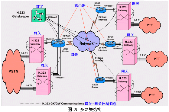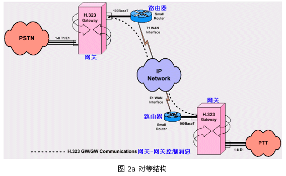 從PSTN來的呼叫被H.323網(wǎng)關受理,把其中的話音流轉換成IP數(shù)據(jù)包經(jīng)過IP網(wǎng)絡傳到目的網(wǎng)關下的指定電話終端;同時受理IP網(wǎng)絡來的呼叫(可以來自電腦終端或另一個PTT網(wǎng)絡)轉向PSTN目的終端1。
