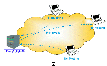 如圖8所示,IP會議包含兩個基本組件:IP會議服務器(IP Conference Server)和IP會議客戶端(如Netmeeting等)。