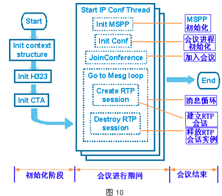 整個IP會議大概過程可以用圖10來說明,各子流程均由MGCP/H.323的相關API函數(shù)完成。