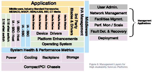圖8展示了管理層的外觀,它兼容PICMG 2.16的CompactPCI平臺(tái)。在較低的水平上,系統(tǒng)的健康和性能度量標(biāo)準(zhǔn)通過(guò)平臺(tái)的可替換單元(FRUs)和中間設(shè)備之間互相通信的平臺(tái)性能提升得以實(shí)現(xiàn)。HA管理軟件層提供健康和性能方面的度量標(biāo)準(zhǔn)和最高層管理應(yīng)用之間的通信。