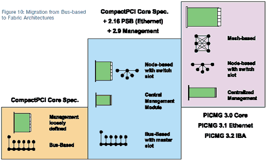 3.0核心規(guī)范上的下一代包交換結(jié)構(gòu),將繼續(xù)向基于節(jié)點(diǎn)的以太網(wǎng)交換插槽和集中式管理的方向發(fā)展,發(fā)展到最后,將過(guò)渡到在CompactPCI總線(圖10)的底板上的網(wǎng)格結(jié)構(gòu)。