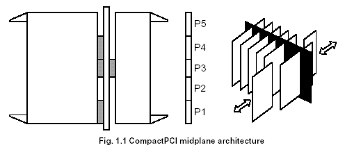 CompactPCI是中間背板結(jié)構(gòu),即有多個卡插在機箱前部和后部的結(jié)構(gòu)。該體系結(jié)構(gòu)的背板位于前向插卡和后向插卡之間,提供機箱中所有插槽間的總線連接和同一機箱中前向和后向插卡之間的連接。所有的插卡通過指定的從P1到P5插槽連接到背板。這些插槽的功能在CompactPCI