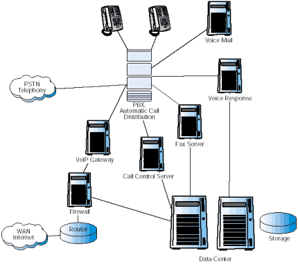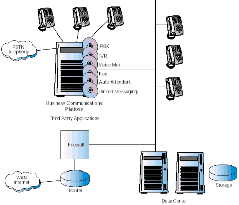圖1描述了當(dāng)前一個典型的復(fù)雜的企業(yè)通信系統(tǒng)配置。連接到PSTN的主要部分PBX/KTS,仍然是系統(tǒng)的核心,提供了交換和自動呼叫分配的功能。一系列增加的應(yīng)用通過附屬服務(wù)器連接到PBX/KTS上。很多附屬服務(wù)器也連到數(shù)據(jù)中心上,因?yàn)樗鼈冃枰L問企業(yè)的數(shù)據(jù)。 使現(xiàn)有情況變得更為復(fù)雜的是,Internet正在變?yōu)椴豢扇鄙俚纳虅?wù)工具,各公司紛紛安裝VoIP以降低網(wǎng)絡(luò)成本,滿足多媒體通信的需要。這些服務(wù)由企業(yè)防火墻后的網(wǎng)關(guān)提供,這個網(wǎng)關(guān)也是連接到PBX/KTS上的。