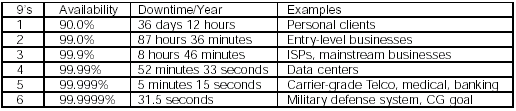 正如表中建議的那樣,實(shí)用性尤其在非常接近1的區(qū)間內(nèi)才被討論。盡管99%的正常運(yùn)行時(shí)間看起來很好,它仍然將導(dǎo)致每年超過3天半的故障時(shí)間。大部分方案不會(huì)被認(rèn)為是高可用的,直到它們接近99.9%的運(yùn)行時(shí)間--大概每年9個(gè)小時(shí)的故障時(shí)間。但是,通信行業(yè)使用4個(gè)9級別到5個(gè)9級別范圍的實(shí)用性。