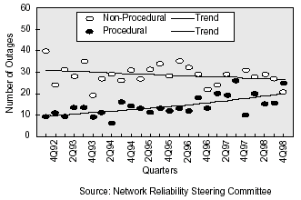 根據(jù)來自網(wǎng)絡(luò)可靠性指導(dǎo)委員會(huì)(NRSC)的研究,對于33%報(bào)告的業(yè)務(wù)中斷,程序出錯(cuò)是根本原因。程序中斷的頻率有上升的趨勢,正如在右面圖中顯示的那樣。