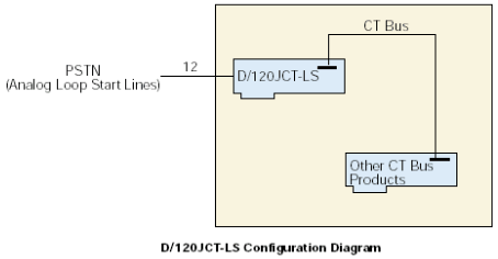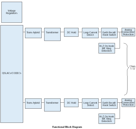 來(lái)自12個(gè)環(huán)路電話線的信號(hào)首先通過(guò)電話線路接口連接到D/120JCT-LS板卡上,該接口提供瞬變保護(hù)和電磁干擾(EMI)刪除(參見(jiàn)子板塊圖)。這些電話線路接口使用可靠的晶體摘掛機(jī)開(kāi)關(guān)(無(wú)機(jī)械接觸)和FCC-Part