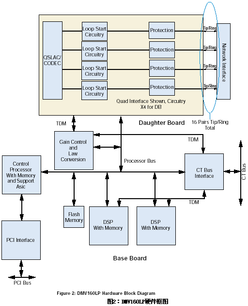 當(dāng)板卡上的呼叫處理資源被利用的時(shí)候,網(wǎng)絡(luò)信號(hào)就被提取出來并且被送到板卡上的控制處理器中,該處理器可以改變信道狀態(tài)而且可以通過共享的RAM和主機(jī)的PCI總線將信道事件傳送給應(yīng)用程序接口。