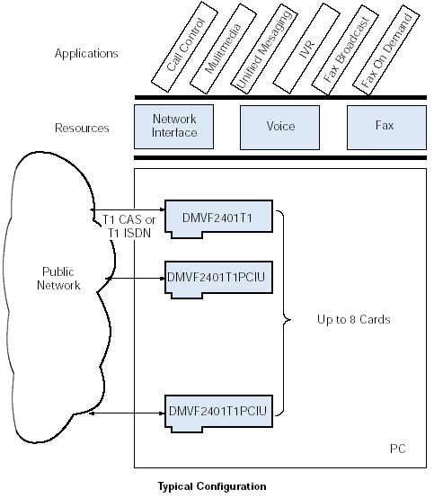 利用DMVF2401TIPCIU以及DMVF3001E1PCIU板卡可以構(gòu)建復(fù)雜的、集成的通訊系統(tǒng)。用戶可以方便的向該系統(tǒng)加入很多功能,比如語音回應(yīng)、按需傳真、傳真廣播、統(tǒng)一消息以及呼叫控制服務(wù)。