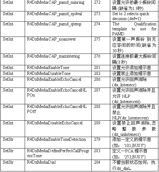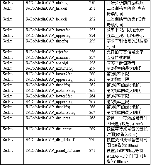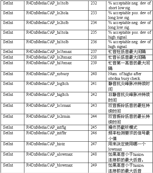 必須注意,調(diào)用API級(jí)的函數(shù)設(shè)置一個(gè)CTADE_A參數(shù)可能不只改變電路板級(jí)的參數(shù)。例如,R4DxMedia中,使用函數(shù)MediaSetBool設(shè)置REGID_R4DxMediaDisableAllToneDetection(280)為0或1來清除Dialogic提示音ID。