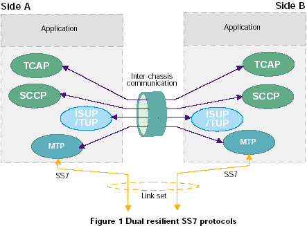 一個SS7系統(tǒng)使用ISUP、TUP或其他國家電話第4層電路交換控制協(xié)議,可以通過分離兩個物理實體(可以是同一機箱中或兩個獨立機箱的兩套板卡)之間的電路終端(每個電路有OPC、DPC和CIC組合唯一標識)達到容錯的目的。下面的描述討論兩個機箱的情況,盡管對于處理SS7和媒質(zhì)的兩套板卡可以使用相同的方法。