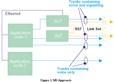 SIU通過從媒介處理中使用以太網(wǎng)分離SS7接口來處理容錯的問題,兩個SIU作為一個節(jié)點編碼進行容錯,如圖5所示,通過分離SS7接口,SIU也允許系統(tǒng)最多可以由32個處理語音電路(媒介)的應(yīng)用節(jié)點組成。