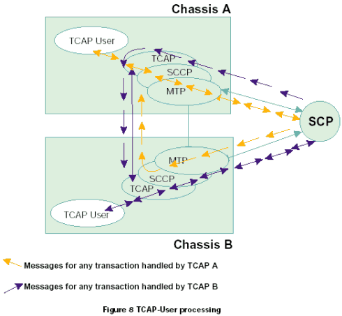 每個TCAP將所有接收的信息傳遞到同機箱中的TCAP用戶任務(wù)中,根據(jù)每一個TCAP中不同的應(yīng)用層或用戶,將TCAP層的應(yīng)用程序發(fā)送的傳送會話和組件原語傳遞給正確的TCAP。在一個雙系統(tǒng)環(huán)境中,接收的消息可以在任何MTP和SCCP層上共享。因此,一個TCAP層接收由其他TCAP處理的應(yīng)用在激活事務(wù)上的TCAP消息是可能的。