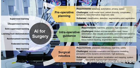圖1:概述了流行的AI技術,以及在術前規(guī)劃,術中指導和外科手術機器人學中使用的AI的關鍵要求,挑戰(zhàn)和子區(qū)域。
