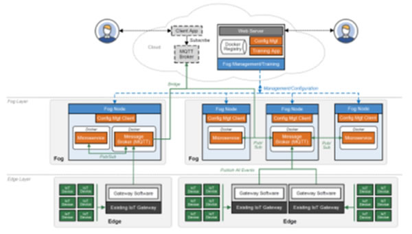 圖2顯示了兩種類型的終端用戶。左邊表示的是那些使用客戶端應(yīng)用程序的用戶,而用戶使用的應(yīng)用程序則利用了來(lái)自邊緣和霧的數(shù)據(jù)。應(yīng)用程序偵聽(tīng)數(shù)據(jù),以某種方式處理數(shù)據(jù),并將數(shù)據(jù)格式化以供用戶查看。右邊的終端用戶是SmartFog管理員,他(或她)負(fù)責(zé)部署和管理來(lái)自云的微服務(wù)。