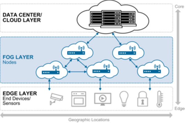 霧計(jì)算是一種新興的計(jì)算范式,它使計(jì)算、存儲(chǔ)、網(wǎng)絡(luò)、加速、分析和管理控制更接近于網(wǎng)絡(luò)的邊緣。它的名字來(lái)源于這樣一個(gè)事實(shí):云在GG的天空,霧則離地面更近。霧計(jì)算的關(guān)鍵是,云(或核心中的企業(yè)服務(wù)器)與物聯(lián)網(wǎng)設(shè)備之間包含一個(gè)霧層,如圖1所示。來(lái)自物聯(lián)網(wǎng)設(shè)備的事件被發(fā)送到靠近網(wǎng)絡(luò)邊緣的霧節(jié)點(diǎn)。