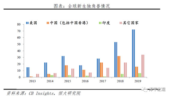 中美印位列新生獨角獸數(shù)量前三。2019年新生獨角獸共128家,美國、中國、印度為新生數(shù)量前三,分別為72家、16家、6家。中國經(jīng)濟增速放緩、互聯(lián)網(wǎng)和移動互聯(lián)網(wǎng)市場格局逐漸固化,2019年中國新生獨角獸數(shù)量較2018年減少50%。
