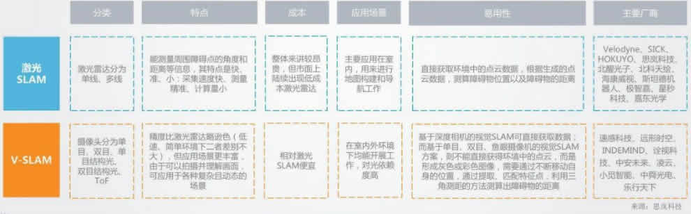SLAM系統(tǒng)通常包含多種傳感器和多種功能模塊。按照核心的功能模塊區(qū)分,目前常見(jiàn)的機(jī)器人SLAM系統(tǒng)可分為兩種形式:基于激 光雷達(dá)的SLAM(激光SLAM)和基于視覺(jué)的SLAM(V-SLAM)。激光SLAM目前發(fā)展比較成熟、應(yīng)用廣泛,未來(lái)多傳感器融合的SLAM 技術(shù)將逐漸成為技術(shù)趨勢(shì),取長(zhǎng)補(bǔ)短,更好地實(shí)現(xiàn)定位導(dǎo)航。