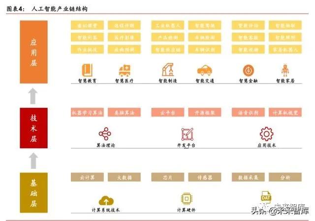 目前,人工智能產(chǎn)業(yè)的生態(tài)系統(tǒng)正逐步成型。依據(jù)產(chǎn)業(yè)鏈上下游關(guān)系,可以將人工智 能劃分為基礎(chǔ)支持層、中間技術(shù)層和下游應(yīng)用層;A(chǔ)層是人工智能產(chǎn)業(yè)的基礎(chǔ),主要提 供硬件(芯片和傳感器)及軟件(算法模型)等基礎(chǔ)能力;技術(shù)層是人工智能產(chǎn)業(yè)的核心, 以模擬人的智能相關(guān)特征為出發(fā)點(diǎn),將基礎(chǔ)能力轉(zhuǎn)化成人工智能技術(shù),如計(jì)算機(jī)視覺(jué)、智 能語(yǔ)音、自然語(yǔ)言處理等應(yīng)用算法研發(fā)。其中,技術(shù)層能力可以廣泛應(yīng)用到多個(gè)不同的應(yīng) 用L域;應(yīng)用層是人工智能產(chǎn)業(yè)的延伸,將技術(shù)應(yīng)用到具體行業(yè),涵蓋制造、交通、金融、 醫(yī)療等 18 個(gè)L域,其中醫(yī)療、交通、制造等L域的人工智能應(yīng)用開(kāi)發(fā)受到廣泛關(guān)注。