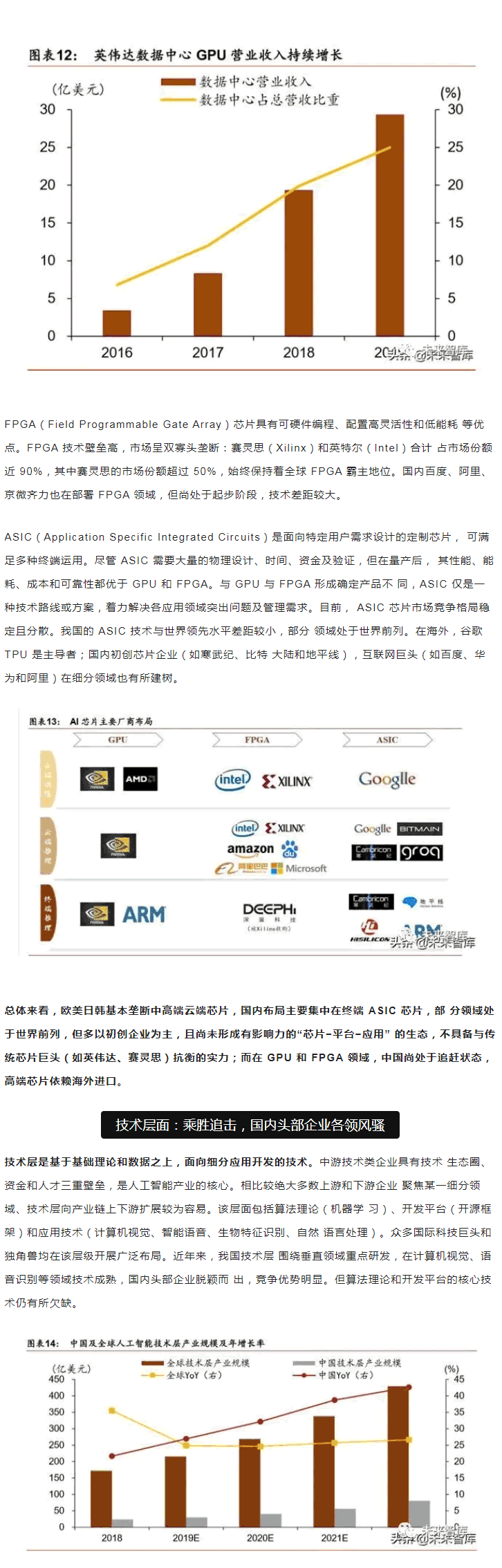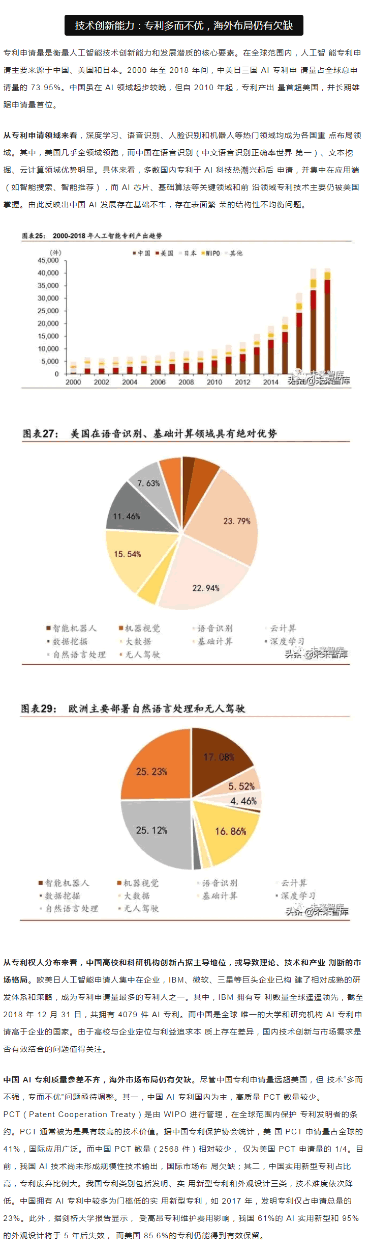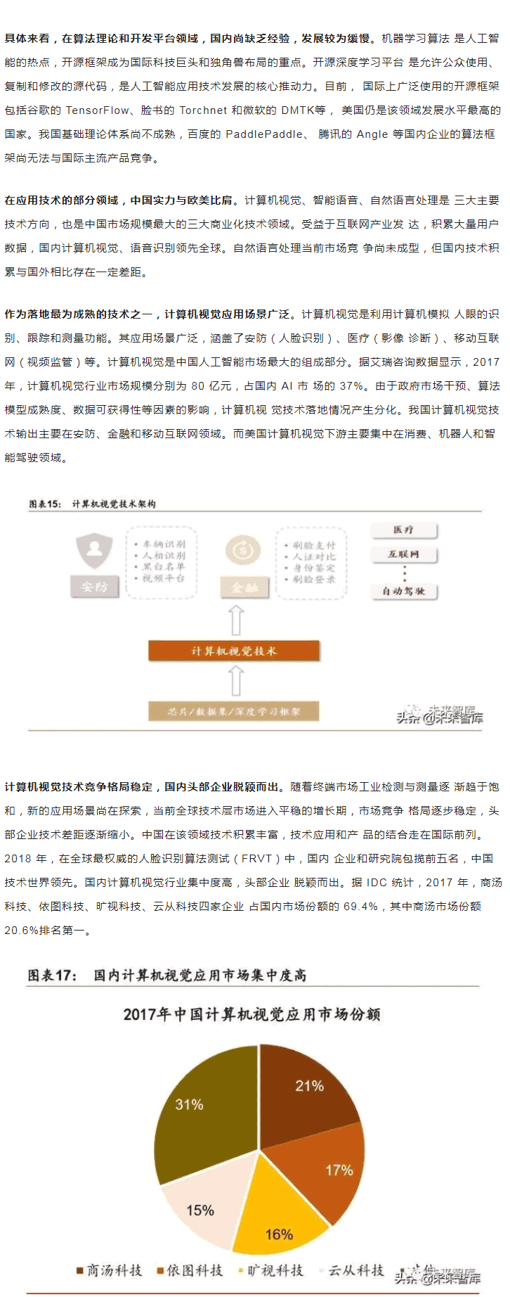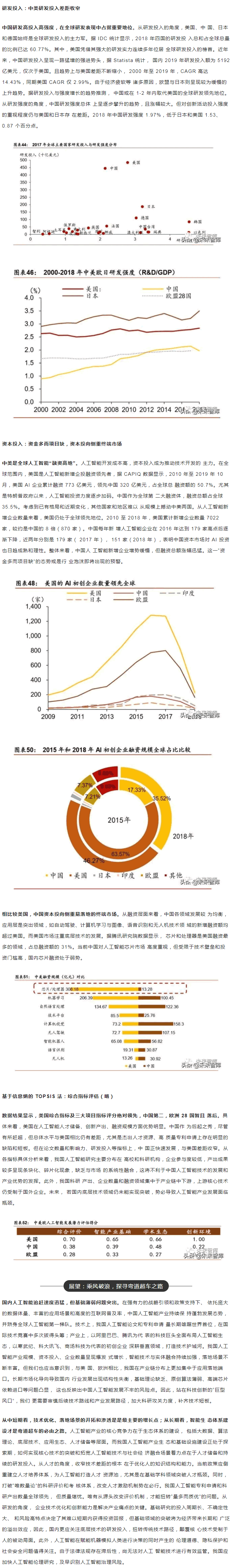 范圍內(nèi),中美“雙雄并立”構(gòu)成人工智能D一梯隊(duì),日本、英國(guó)、以色列和法國(guó)等發(fā) 達(dá)國(guó)家乘勝追擊,構(gòu)成D二梯隊(duì)。同時(shí),在D層設(shè)計(jì)上,多數(shù)國(guó)家強(qiáng)化人工智能戰(zhàn)略布局, 并將人工智能上升至國(guó)家戰(zhàn)略,從政策、資本、需求三大方面為人工智能落地保駕護(hù)。后起之秀的中國(guó),局部L域有所突破。中國(guó)人工智能起步較晚,發(fā)展之路幾經(jīng)沉浮。自 2015 年以來(lái),政府密集出臺(tái)系列扶植政策,人工智能發(fā)展勢(shì)頭迅猛。由于初期我國(guó)政策 側(cè)重互聯(lián)網(wǎng)L域,資金投向偏向終端市場(chǎng)。因此,相比美國(guó)產(chǎn)業(yè)布局,中國(guó)技術(shù)層(計(jì)算 機(jī)視覺(jué)和語(yǔ)音識(shí)別)和應(yīng)用層走在世界前端,但基礎(chǔ)層核心L域(算法和硬件算力)比較 薄弱,呈“頭重腳輕”的態(tài)勢(shì)。當(dāng)前我國(guó)人工智能在國(guó)家戰(zhàn)略層面上強(qiáng)調(diào)系統(tǒng)、綜合布局。