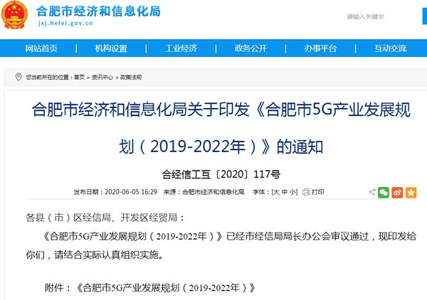 2020年6月1日,合肥市經(jīng)濟(jì)和信息化局印發(fā)《合肥市5G產(chǎn)業(yè)發(fā)展規(guī)劃(2019-2022年)》。