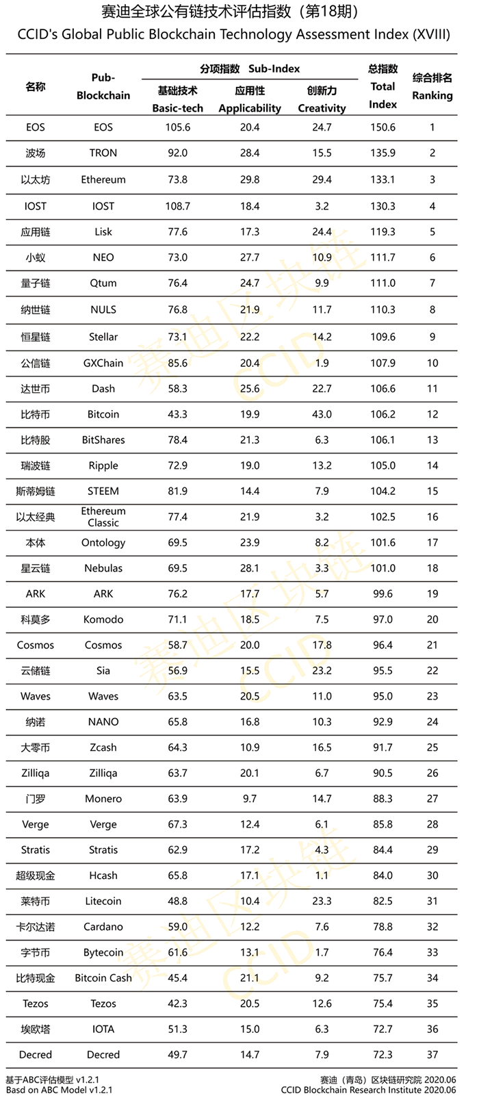 2020年6月18日,中國電子信息產(chǎn)業(yè)發(fā)展研究院(賽迪研究院)發(fā)布第18期賽迪公有鏈技術評估指數(shù),對37條知名公有鏈從技術維度進行綜合考量并給出排名。