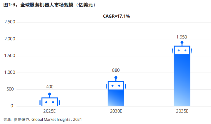 研究表明 ,服務(wù)機(jī)器人產(chǎn)業(yè)蓬勃發(fā)展 ,產(chǎn) 業(yè)規(guī)模持續(xù)增長(zhǎng)。據(jù)研究數(shù)據(jù)顯示 ,服務(wù)機(jī)器人行業(yè)已進(jìn)入快速發(fā)展期 ,市場(chǎng)規(guī)模增長(zhǎng)強(qiáng)勁。2025年,服務(wù)機(jī)器人(全產(chǎn)業(yè)鏈)市場(chǎng)規(guī)模預(yù)計(jì)達(dá)到400億美元。未來十年將以17.1% 的復(fù)合年增長(zhǎng)率增長(zhǎng),到2035年,服務(wù)機(jī) 器人市場(chǎng)規(guī)模有望達(dá)到1,950億美元 ,市場(chǎng)潛 力巨大。